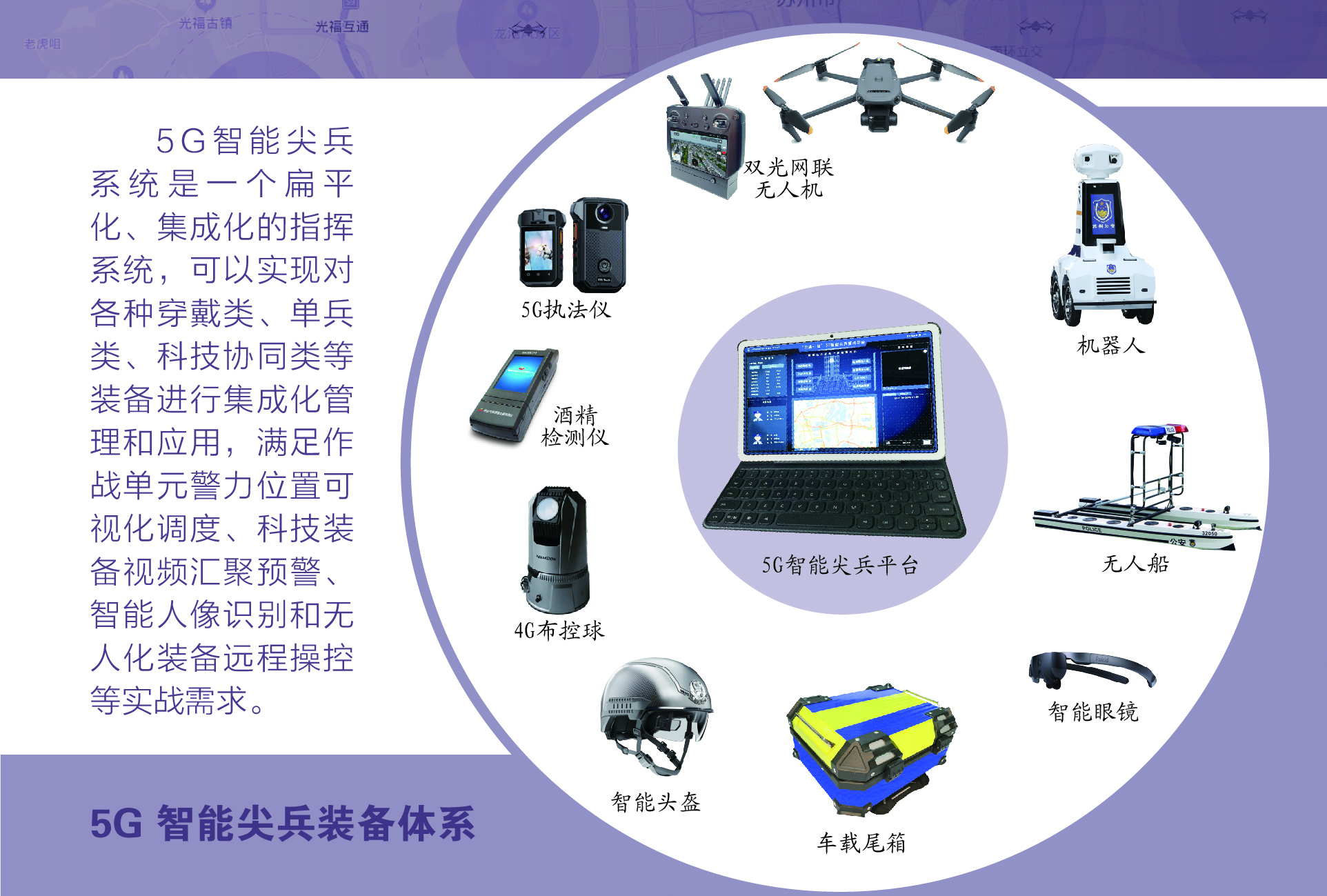 5G智能尖兵裝備系統,概括為“1+N+1”科技裝備體系,即立足基層一線巡特警和公安派出所的最小作戰單元,圍繞科技類單警、車載和協同裝備的實戰使用集成,深度打造應對常態化立體巡防、現場特殊案事件或重大警情處置,實現前端作戰單元與后臺情指中心的扁平化指揮,力求成為科技賦能戰斗力提升的倍增器。